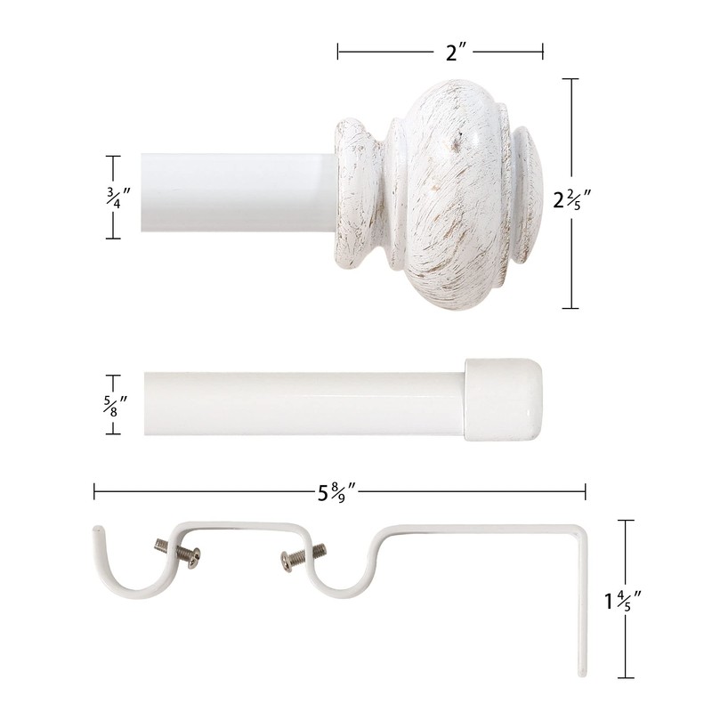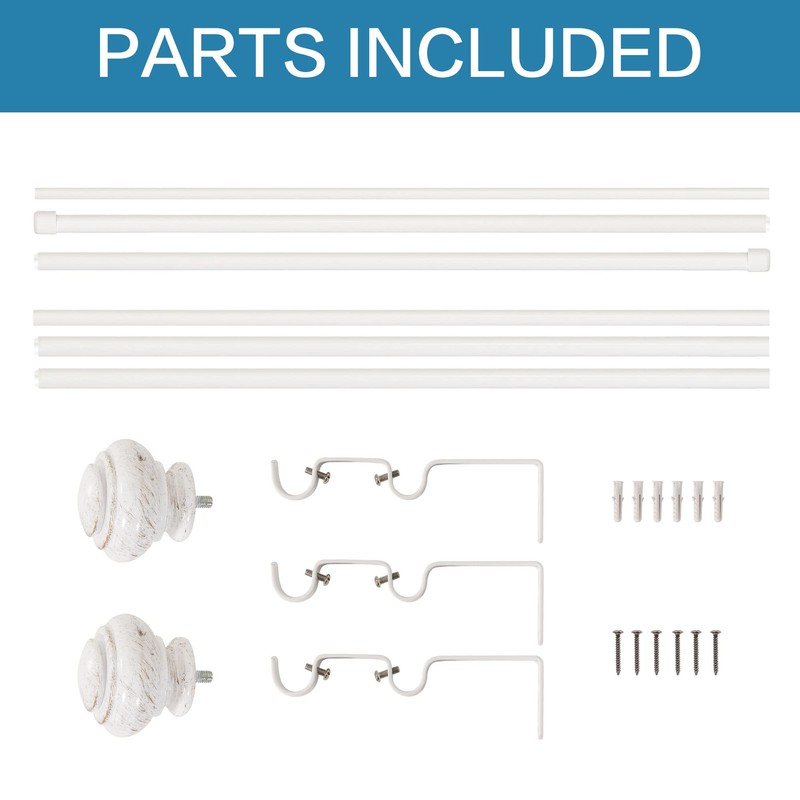 - High quality steel adjustable double curtain rods (Each rod with 1 outer rod and 1 inner rod), 3 mounting brackets, 2 resin finials and 2 end cap finials.