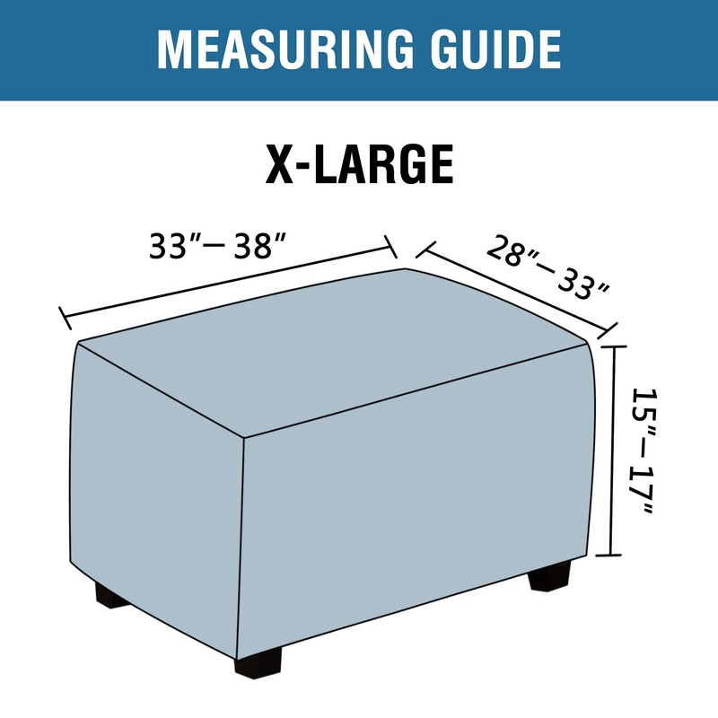- Sizes: Large size, fit most ottoman with 29”-34" length, 24”-28" width, 15”-17" height / X-Large size, fit most ottoman with 33”-38" length, 28”-33" width, 15”-17" height / XX-Large size, fit most ottoman with 56”-75" length, 29”-37" width, 15”-17" height