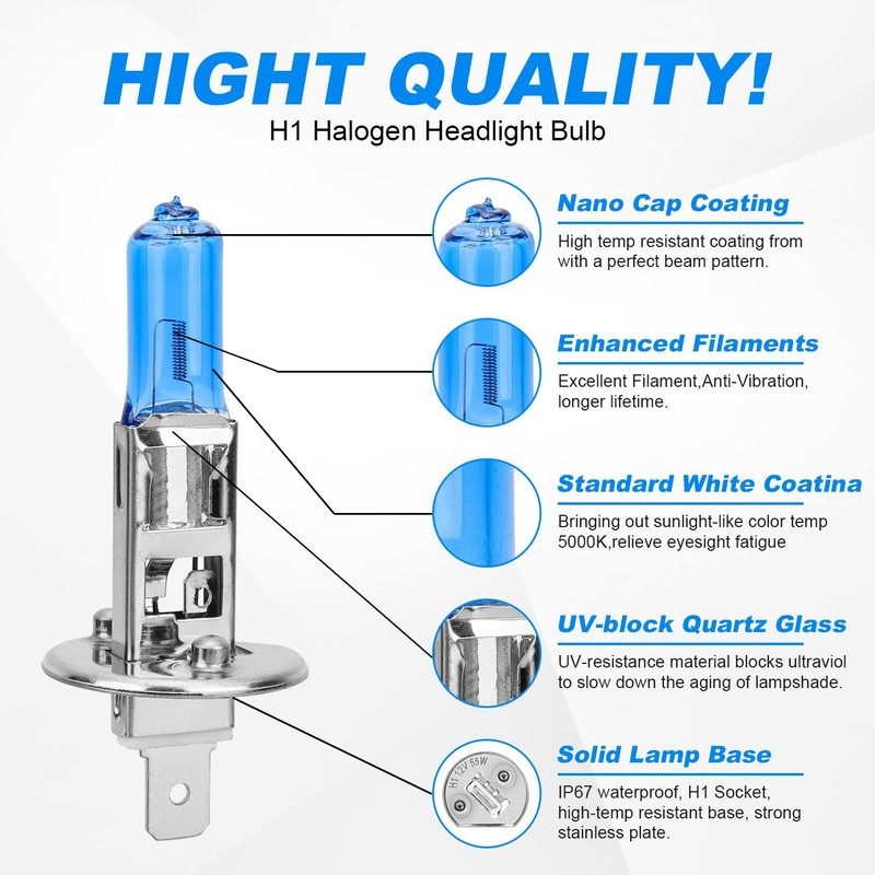 - 【LONG LIFE】H1 halogen lamps are built to last. They offer more than 1000 hours life., so you don't have to replace bulbs frequently. Enjoy constant, reliable lighting for many hours of driving.
