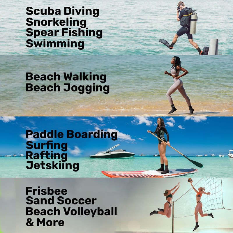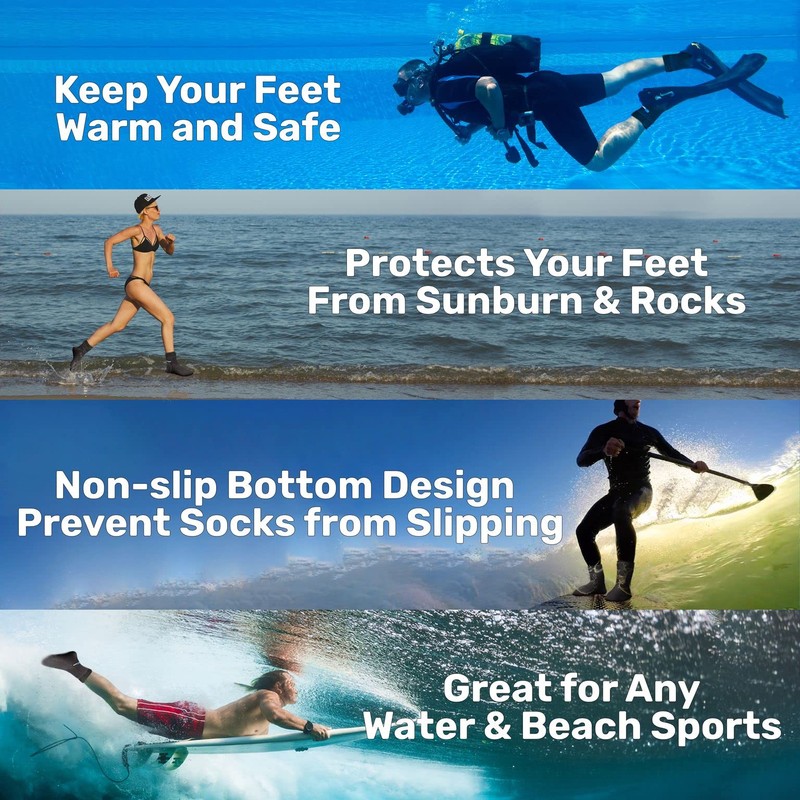 - DIVING SOCKS - Designed to last, these waterproof socks are great for stress free beach walking, surf board, scuba diving, swimming activities and for all other water sports with superior comfort.