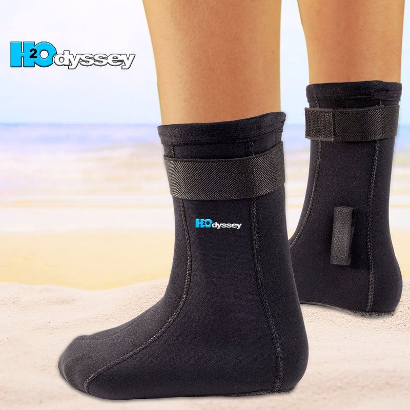 - UNIQUE DESIGN - H2Odyssey 3mm neoprene extra high ankle scuba socks come with a flexible fit velcro strap for just right tight fit and prevents sand pebbles and cold water coming in!