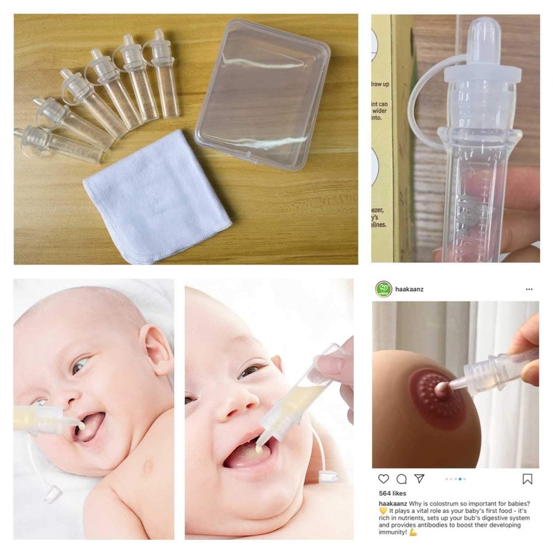 - Collect, store and feed colostrum from the same container. How to use: Soft squeezable silicone has a vacuum effect to collect droplets. Nib suctions colostrum off the nipple, can also be removed to express directly into the collector. Store and freeze according to guidance. When ready to feed, just squeeze the collector to feed the liquid gold to newborns.