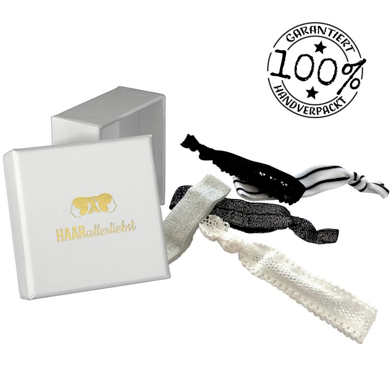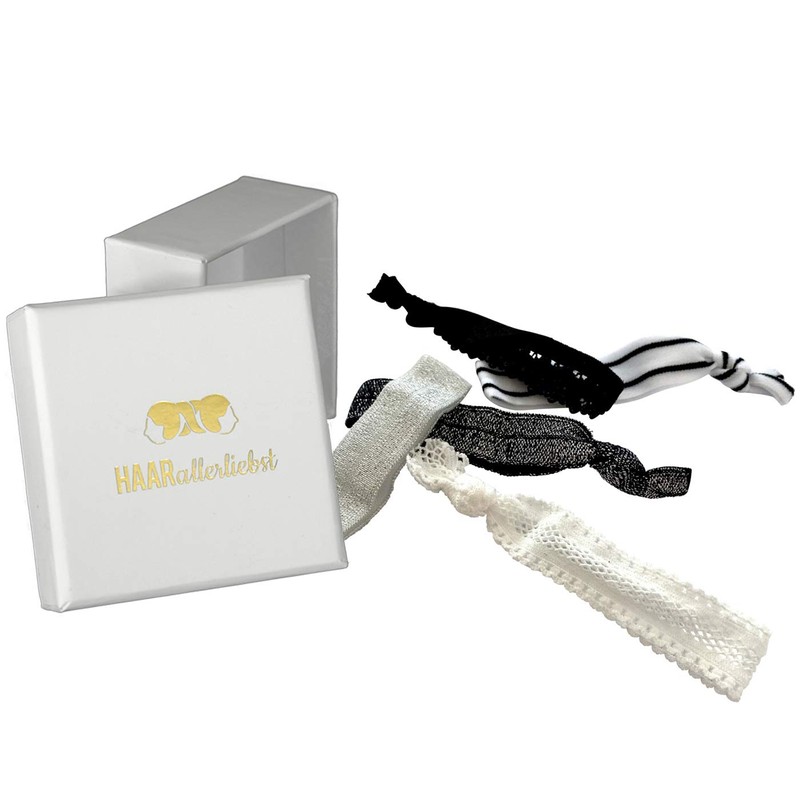 HAARallerliebst Hair Scrunchies Bracelets (Pack of 5) with Box for Storage (White - Black / White)