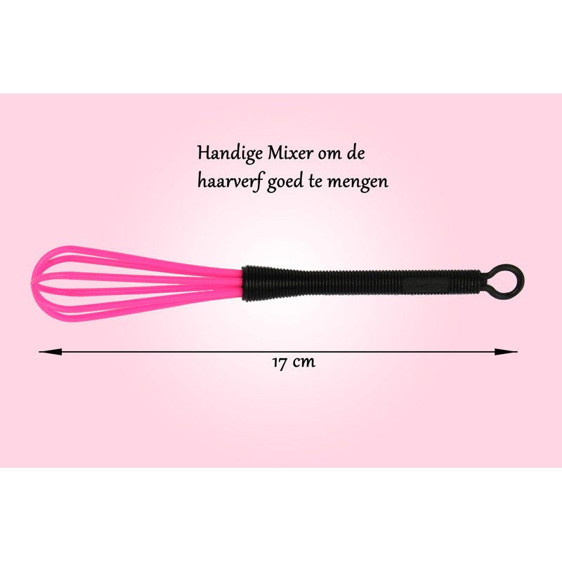 • - 400 ml Mischbehälter mit Griff - Mixer zum Mischen der Farbe - Pinsel 6 cm - Extra Pinsel 6 cm - 3-in-1-Kamm mit einer spitzen Spitze. - Ohrenschützer, die die Ohren vor dem Haarfärbemittel schützen und wasserdicht sind. - Eine Tasche mit Reißverschluss zur Aufbewahrung des Farbsets