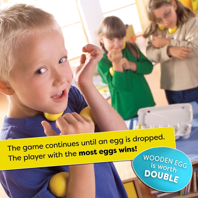 - READY-TO-PLAY WITH QUALITY PIECES: Includes 9 bouncy rubber eggs, 1 solid wooden egg, 2 dice, and a full-color instruction booklet. Built to last through many game nights and party games.
