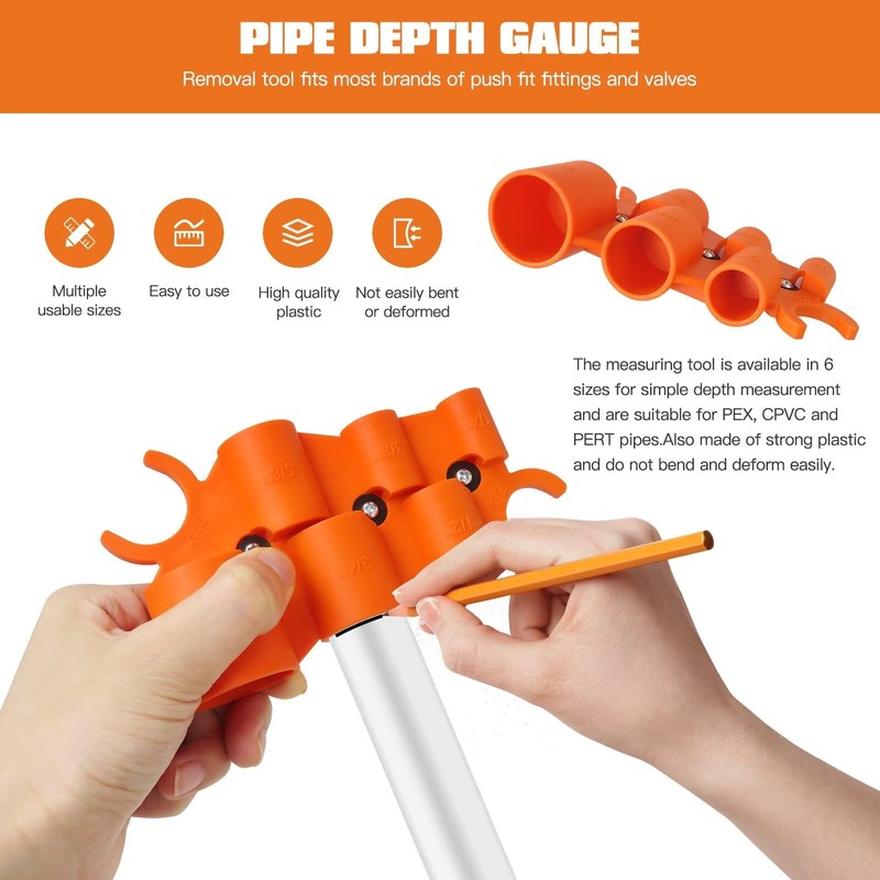 - 【6 In 1 Depth Gauge Tool】this pipe deburring pipe and depth gauge tool has 6 sizes: 1/4", 3/8", 1/2", 5/8", 3/4", 1"; Removal tool fits most brands of push fit fittings and valves; Easy to measure insertion depth and after the pipe is inserted; It is an essential cutting and fixed tool for home handymen and plumbers