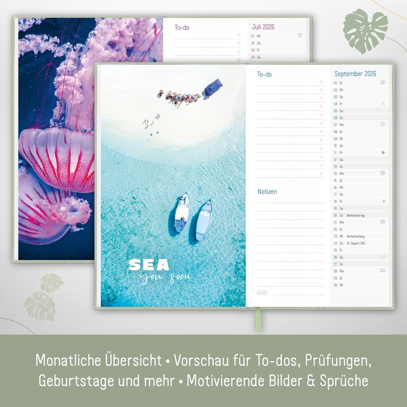 - Pocket school planner 2025/2026 A6 slim – running time: August 2025 - September 2026, with 1 week on 2 pages, monthly previews, atmospheric pictures and sayings, ribbon marker, timetables, note pages for free filling and more