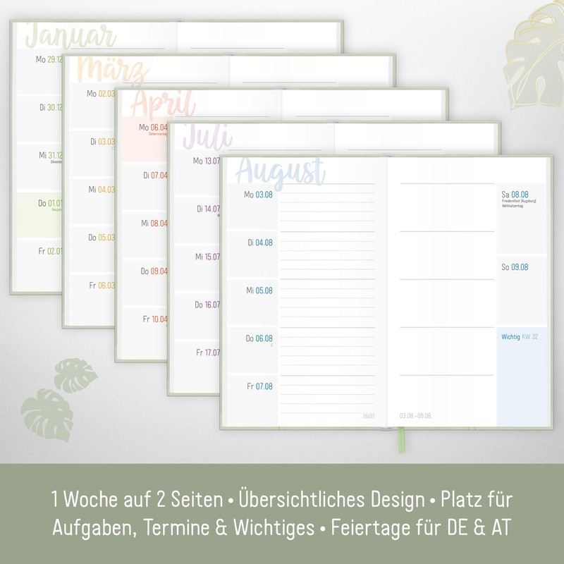 Häfft - Timer A6 Slim 2025/2026 "Green Monstera" Student Calendar in Pocket Format - Student Planner, School Planner, Study Planner, Semester Planner for Upper Level, Training or Study