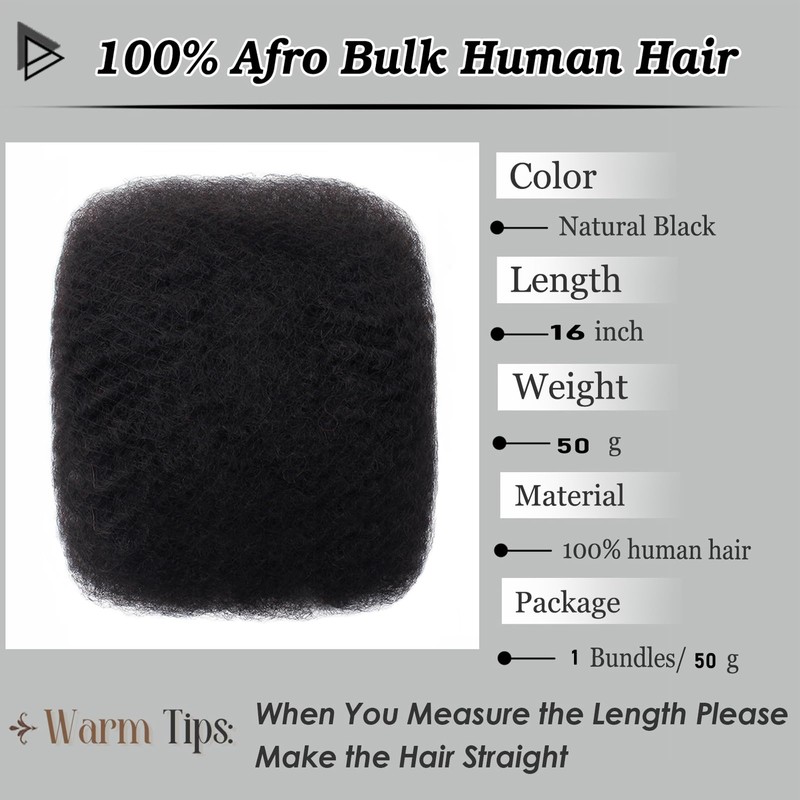 - 【100% Afro Bulk Human Hair】 Made from 100% Real human hair, this Afro Kinky bulk hair is soft, durable, soft to the touch, light, full, looks natural and long-lasting. It can be treated just like your natural hair, allowing you to dye and braid it with heat tools for a personalized look. No tangles, no shedding, no chemical smell and will not cause skin itching and allergies.