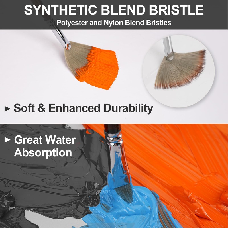 - Synthetic Blend Bristles: The Polyester and Nylon blend bristles provide great water absorption capacity smoothing colouring movements during all kinds of paintings, also its distinctive pliancy speciality with ameliorated crafting which keeps the bristles shape after longtime use.