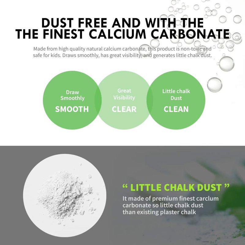 A special feature this chalk has is that it is well coated preventing the chalk from cracking or breaking under pressure. In addition, it prevents chalk dust from staining hands.
