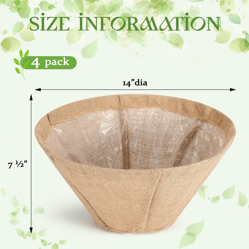 - Complete Set: experience convenience with this complete set of 4 round burlap liners; Impeccably designed with a 14-inch diameter to fit your hanging baskets; Each package gives you everything you need for your indoor or outdoor gardening requirements