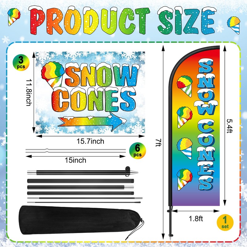- Sizes for Maximum Visibility: with generously sized components, this set is designed to draw in thirsty customers; The snow cones stand sign measure 11.8 x 15.8 inches, the swooped feather flag extends to a full 7 Ft, and the snow cones banner stretches over 3 x 8 Ft