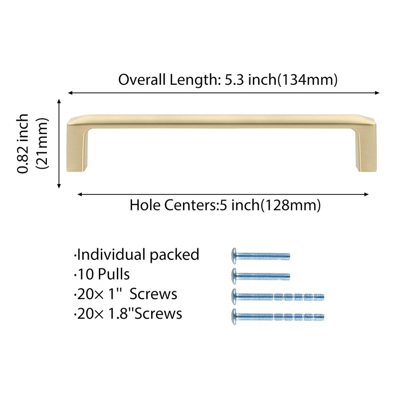• Carefully Packaged: These 5 inch matted gold cabinet pulls are wrapped independently to avoid scratch in transit. Two-sized screws of 1" and 1.8" length per pull, the longer screws have also received a more corrosion-resistant process and can be tailored to use from 0.9inch(23mm) to 1.69inch(43mm).