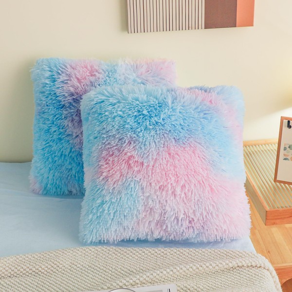 HAIHUA Faux Fur Tie Dye Fluffy Pillow case, Soft Tie Dye Decorative Fuzzy Pillow case, Fluffy Pillow Covers for Home Bedroom Living Room, Zipper Closure, Set of 2 (Tie Dye Blue, 18"x 18")