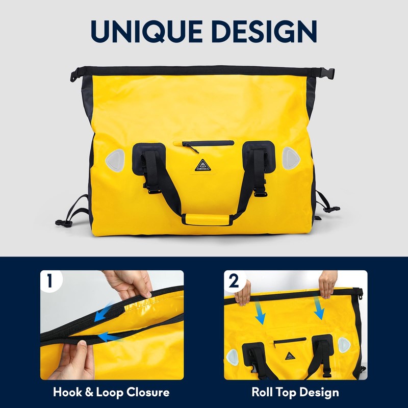- Waterproof Duffel Bag: Haimont motorcycle dry bag is made of high grade tarpaulin which is 100% waterproof, also the most durable material, rolling up design with high frequency welded seams makes the waterproof performance more reliable