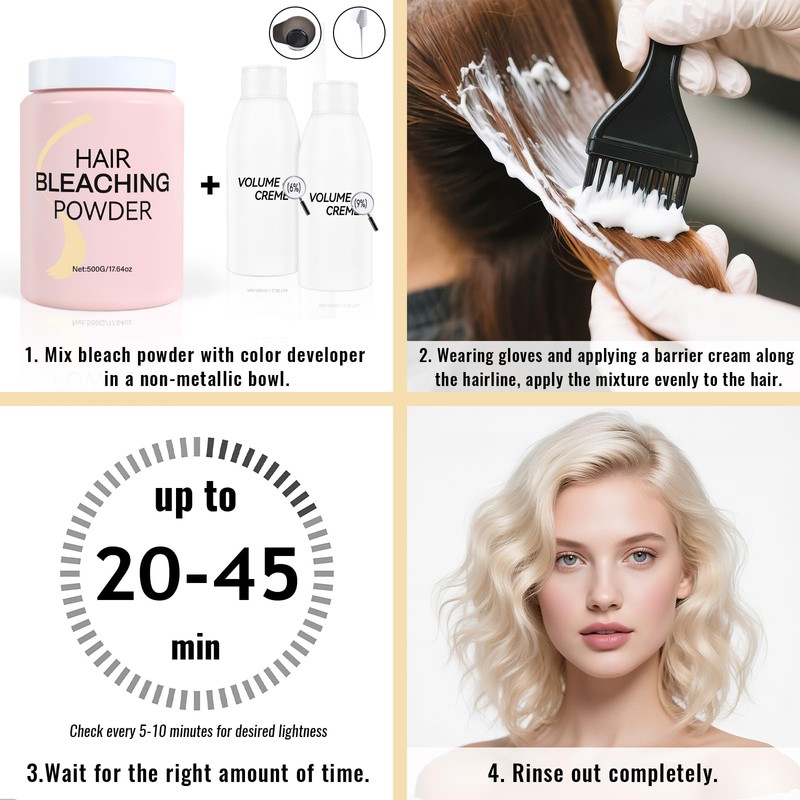 - NOTE: Due to the different hair texture of each person, the hair color effect may vary, the specific effect is subject to the actual effect. This product only contains bleaching powder, does not contain developer, if you need developer, please purchase separately.