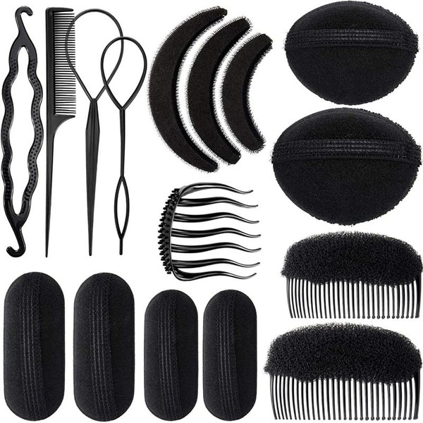 - Package included: You will receive 16 pcs of sponge hair styling accessories, including 3 pcs hair braiding tools in 3 shapes, 1 pc hair comb, 3 pcs hair base inserts, 9 pcs sponge bump up in 5 style, many different kinds of tools to satisfy your different hair style needs.