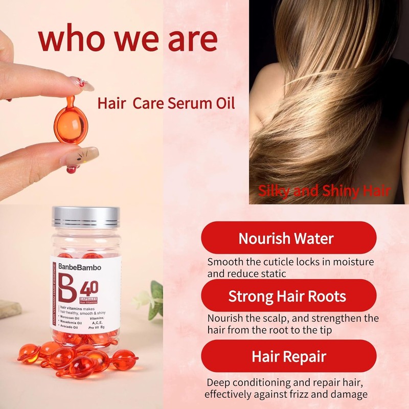 - [Natural Nourishing Hair Oil Capsules with Elasticity Boost] Our BanbeBambo Hair Care Serum,as hair oil capsule treatment deeply hydrate frizzy, damaged hair. Plant-derived oils help smoothign hair cuticle while enhancing elasticity. Apply capsule oil to dry damaged Hair. This hair care serum enriched formula improves dry damaged hair, and supports hair resilience. A no-rinse essence locks in moisture to reduce static electricity and minimize tangles. It promotes visibly healthier-looking, shinier hair