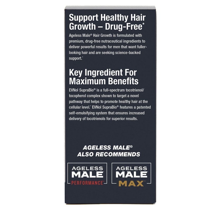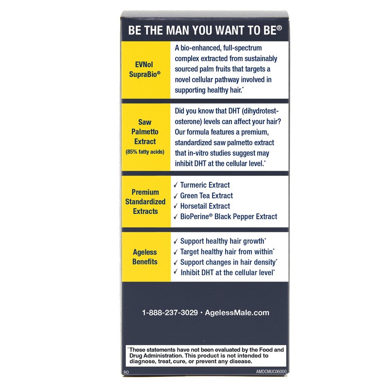 - SAFE, EFFECTIVE & DRUG FREE: Ageless Male Hair Growth comes to you from Ageless Male, a trusted brand in men’s health. By combining EVNol SupraBio and biotin with standardized extracts like saw palmetto, green tea, and horsetail, it provides optimal support for healthy hair growth and is safe to take every day