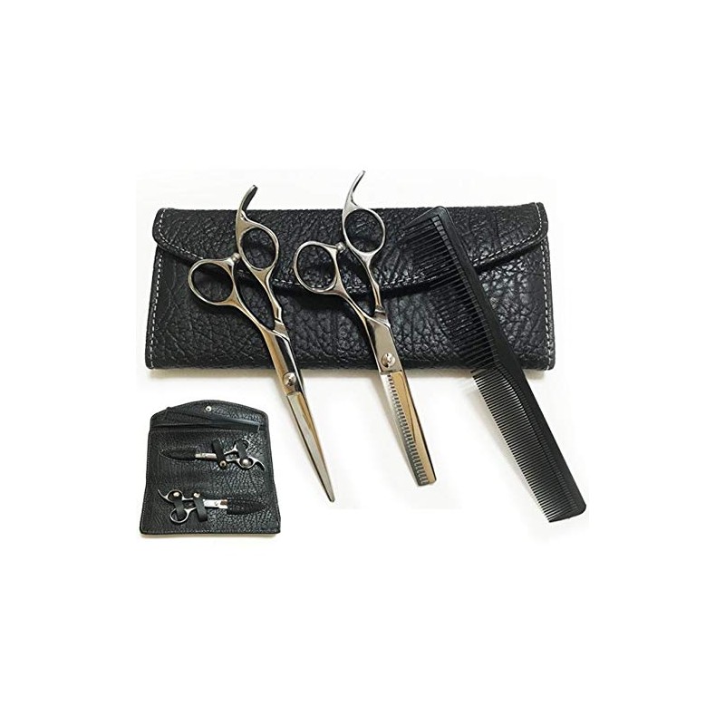 - Set Contents: Scissors, scissors, comb, screw fastener plate, storage pouch (faux leather).