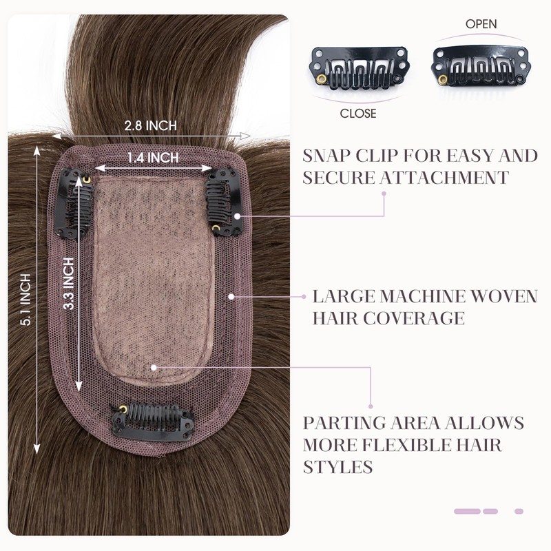 - Secure Pressure Sensitive Clips - The silk base has 3 clips that are easy to apply, secure, lightweight, non-damaging to your scalp for long time wearing. The coated clips use similar tones coating to the topper hair that helps better blending.