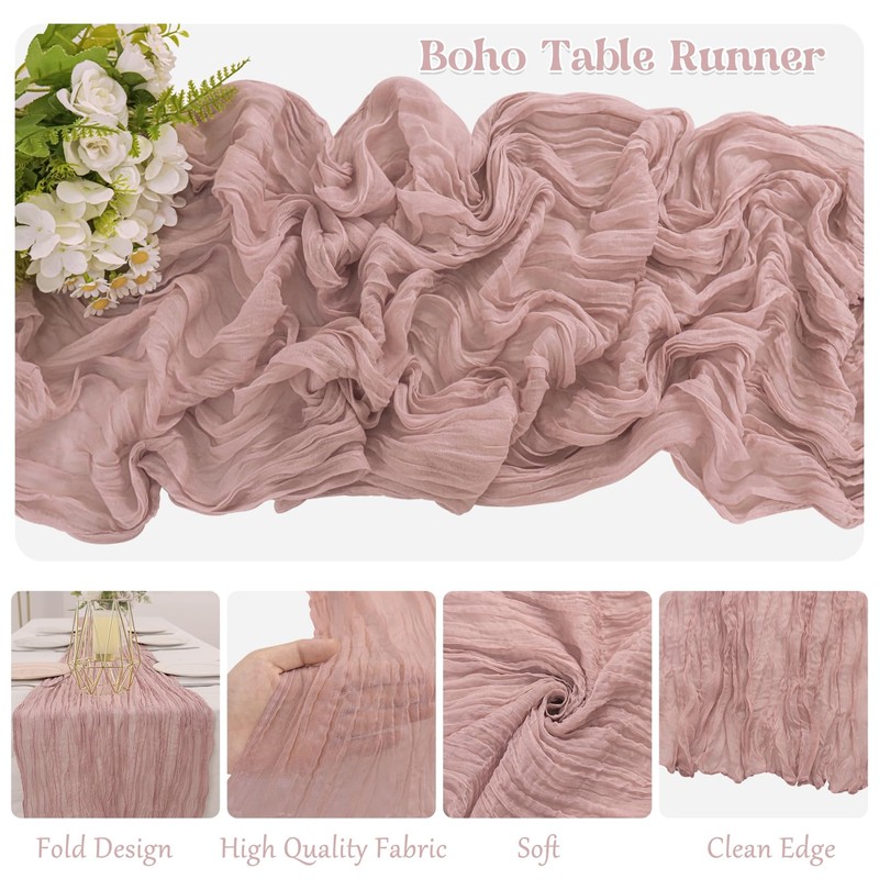- Gauze Rustic Table Runner:The dusty pink sheer table runner features a natural wrinkled design and boho style, making it a perfect decoration for your table. The gauze cheesecloth table runners can sway in the wind, adding an elegant and romantic atmosphere.