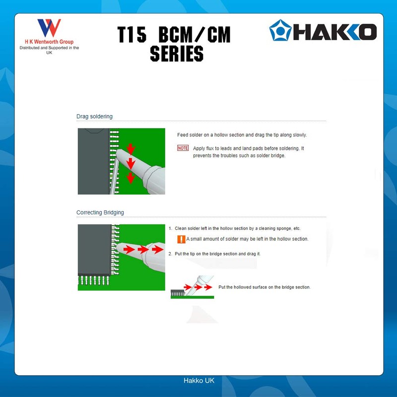 • When the tip is placed, solder left in a hollow section absorbs solder in the bridge section. Please use this shape if solder amount of the bridge is small, If solder amount of the bridge is large, Shape J, K and H are recommended.