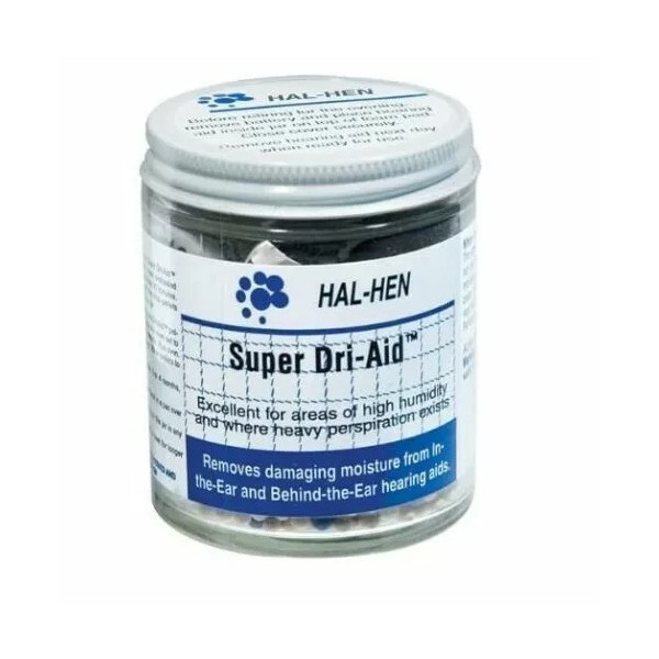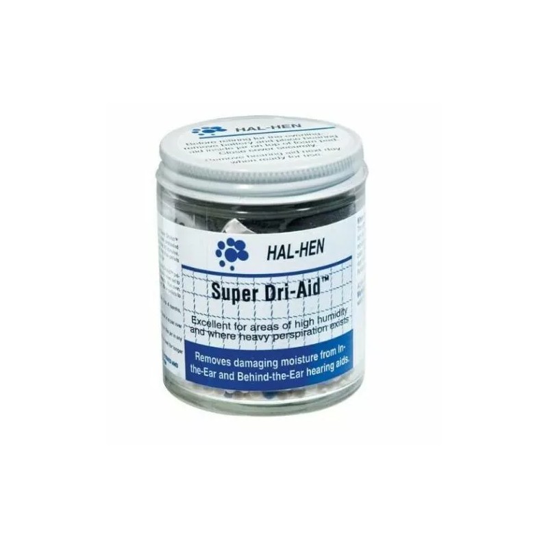 - Hal-Hen Super Dri-Aid Dehumidifier Removes Damaging Moisture from all In-The-Ear and Behind-the-Ear hearing aids Protects your valuable hearing aid Extends the life of your hearing aid Comact size -ideal for home, office, or travel