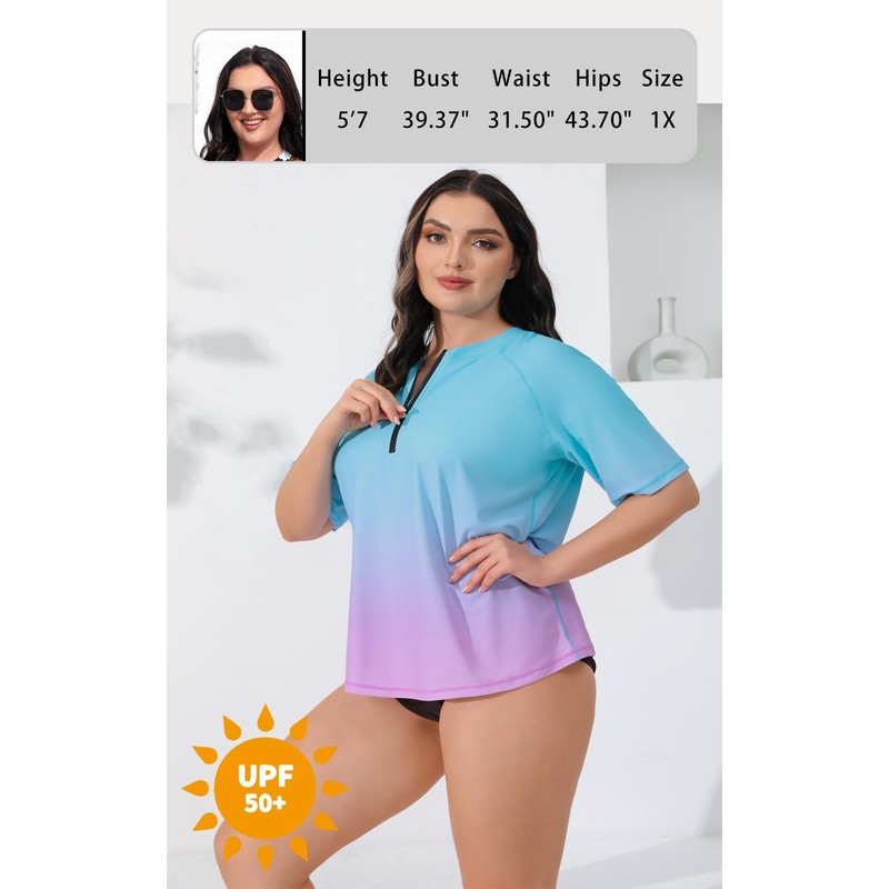 Halcurt UV Shirt Women's Plus Size Rash Guard UPF 50+ Sun Protection Swimming Shirt Swimming Shirt Quick Drying Swimwear 1X-4X, Ombre Blue Pink