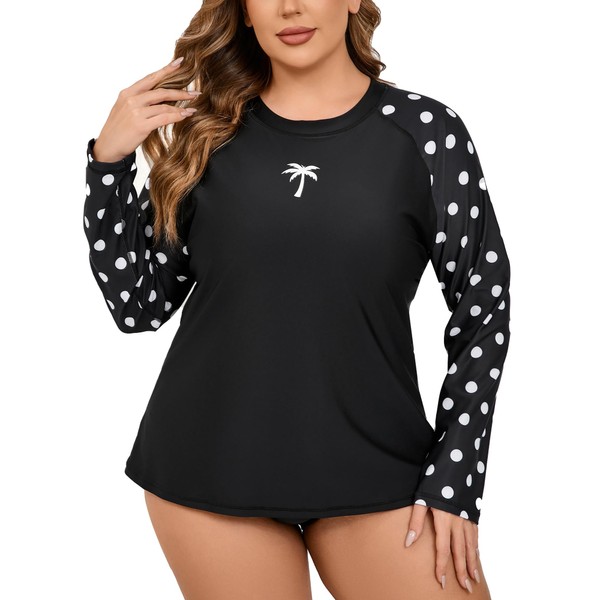 Halcurt Womens Plus Size Long Sleeve Rash Guard Swim Top with Built in Bra Loose Fit UPF50+ Sun Protection Swimsuit Black Polka Dots 1X