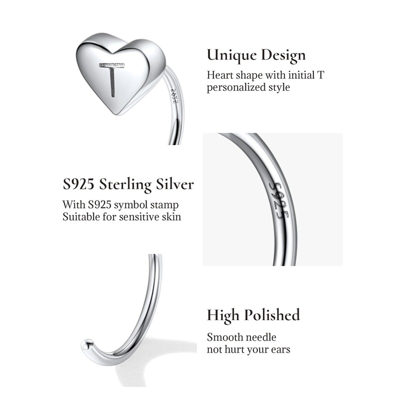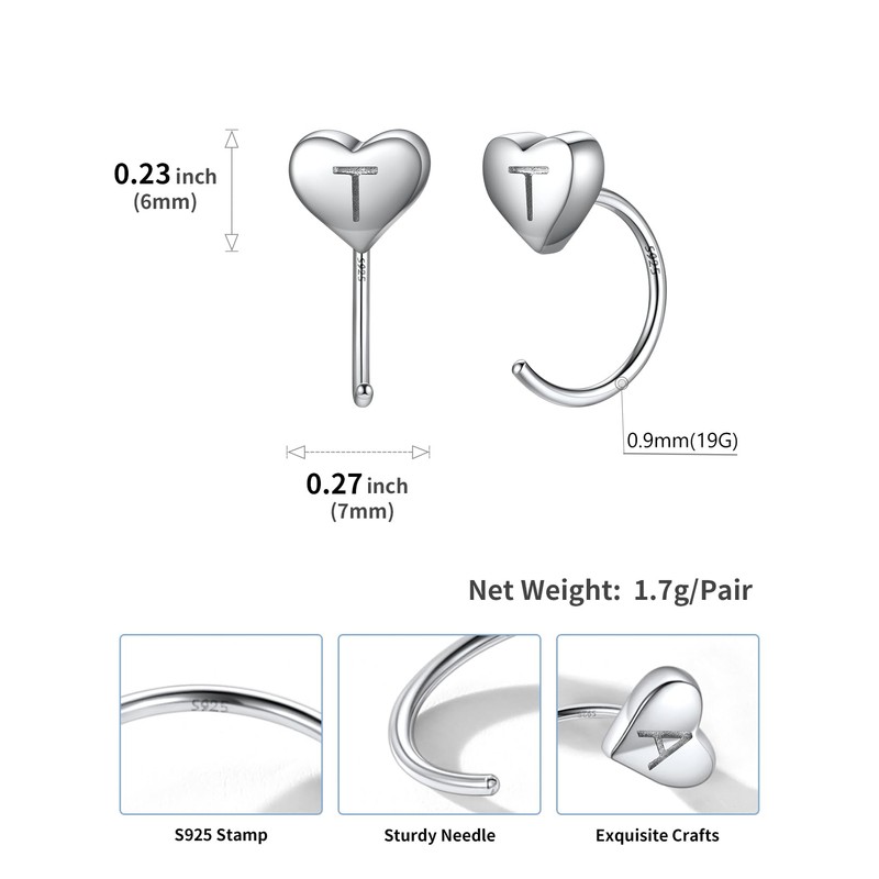 Half Hoops Heart Earrings Studs, 925 Sterling Silver Tiny Sleeper Earrings for Women, Initial T