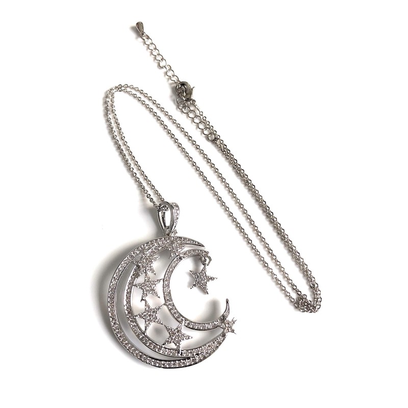 This is an elegant and delicate silver plated cable chain with a gorgeous half moon and stars cubic zirconia silver plated pendant, finished with a comfortable lobster claw clasp.