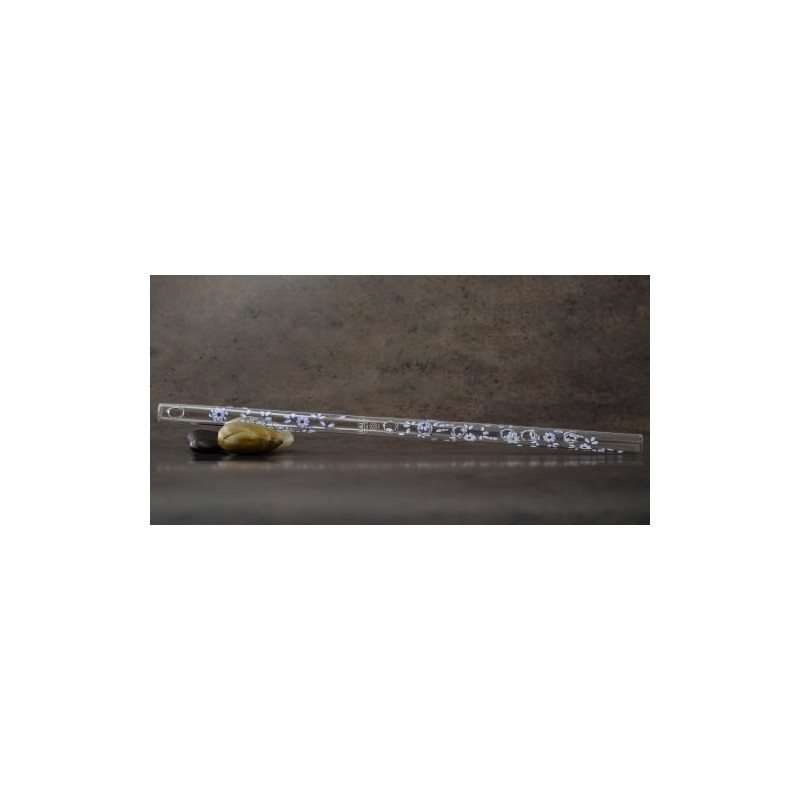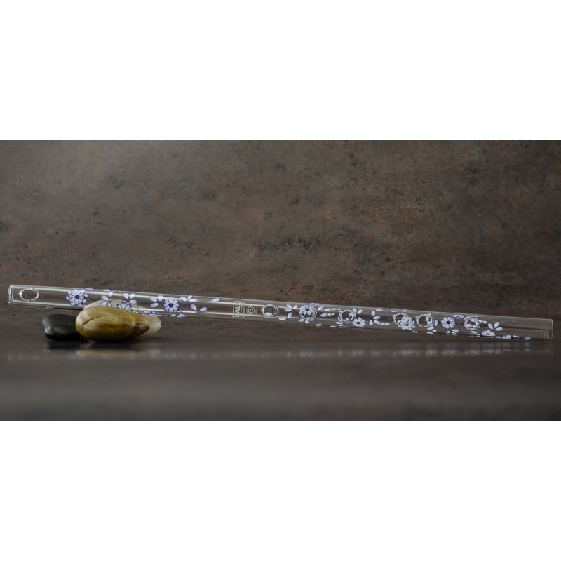 This Hall Crystal Flute is handcrafted in Washington State, USA by flute maker James Hall. Starting with precision borosilicate glass tubing, it is sealed and carefully shaped to create a Boehm taper producing beautiful and accurate tones throughout its tonal range. After shaping and tuning the tone holes, the flute is decorated and kiln fired to fuse the decorations and insure durability. Each flute is a handcrafted work of glass art. This flute will arrive nestled in a classy foam lined dark-green storage box with gold stamped logo, along with a complete fingering chart. Free sheet music is avalible on the Hall Crystal Flute website.