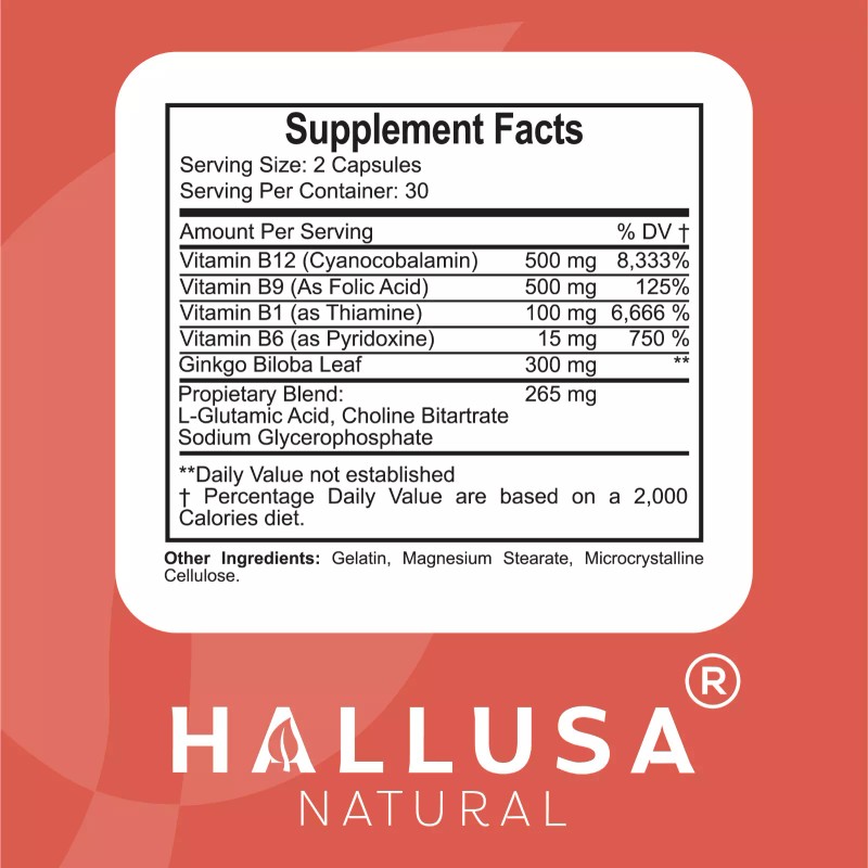 HallMemory - Ginkgo Biloba - Vitaminas - Factor de enfoque - Apoyo energético - 60 cápsulas