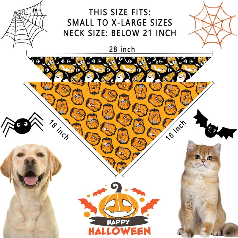 • Size and Quantity: The handkerchief measures about 28 x 18 inches, each pack contains 2 pieces, both bandanas were full of halloween day atmosphere, each one is well designed and making your pets more fashion and lovely.