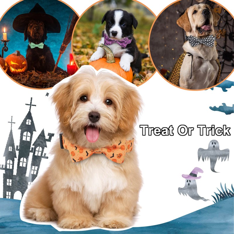 • 🐈️【𝑪𝒖𝒕𝒆 𝑩𝒐𝒘𝒕𝒊𝒆 𝑫𝒆𝒔𝒊𝒈𝒏】The bowtie is attached to the halloween collars for dogs with an elastic strap and can be removed as you like. The bow tie is hand-sewn and made of cotton, comfortableand comfy, while nylon one may do harm your pet's skin. It is ideal fun decorative collar set for your loved pets and the cute bowtie will make your puppies look charming and fashionable.