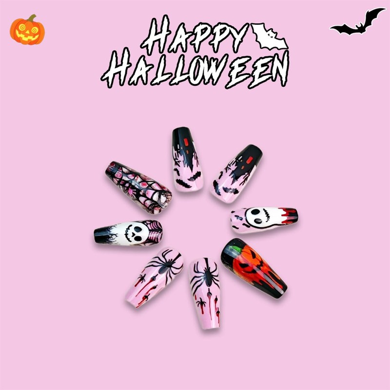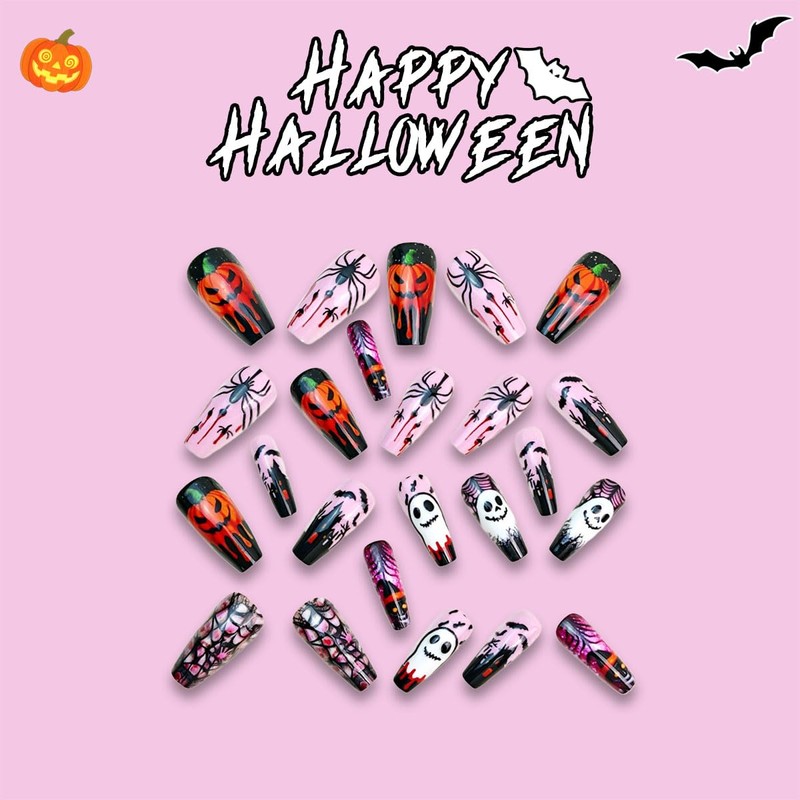 - 【Package content】The package have 24PCS pumpkin spider web ghost fake nails, includes 12 different sizes, 24 pieces of jelly glue, 1 mini nail file,1 small wooden stick.The nail set will allow you to complete a pleasant manicure journey.