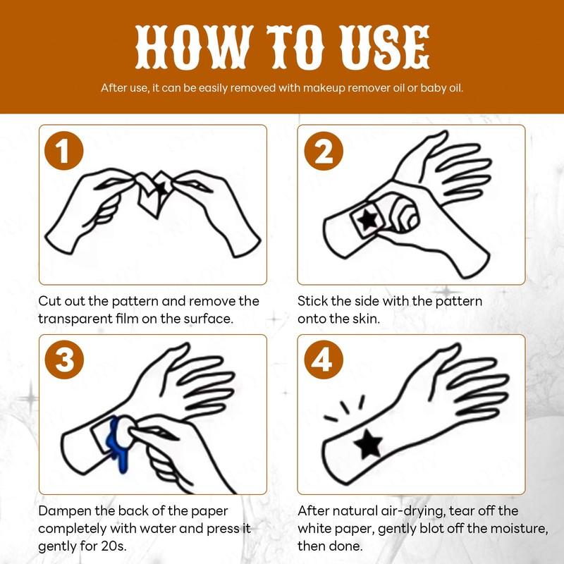 • Convenient Application and Removal: Simply place the tattoo sticker face down on clean, dry skin, moisten thoroughly with a towel, and wait 20-30 seconds before easily peeling off the backing paper. It can be easily removed with alcohol or baby oil, making it convenient and quick.