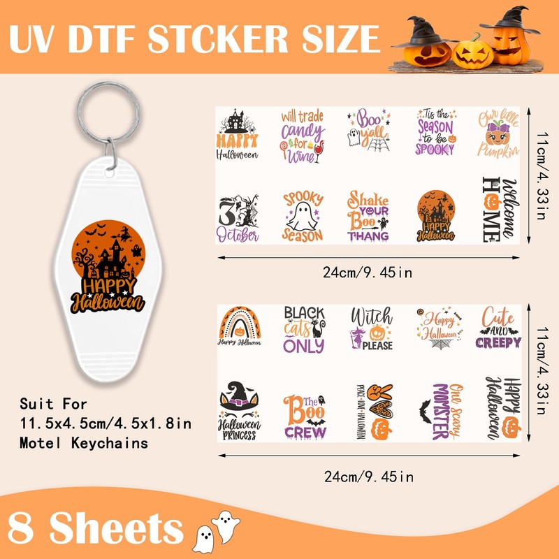 - Motel Keychain UVDTF Stickers: You'll receive 8 sheets of Halloween UV DTF stickers designed specifically for hotel keychains. Our motel keychain stickers has 2 sets of patterns, with 4 sheets in each set. These uvdtf stickers are suitable for decorating, you can use the stickers to DIY your blank motel keychains or decorate your other Halloween items.