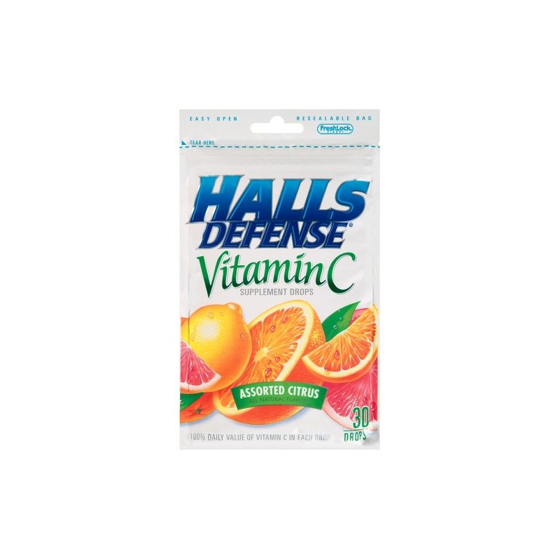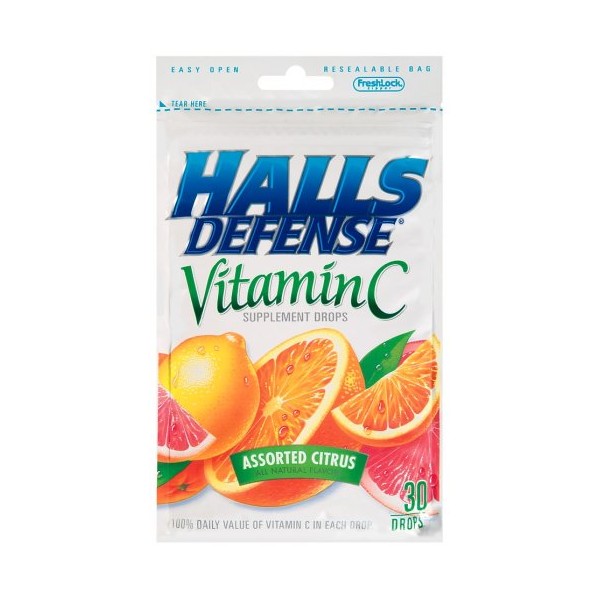- One package of 30 HALLS Defense Assorted Citrus Vitamin C Drops (packaging may vary). Dietary supplement contains vitamin C as an immune system booster.