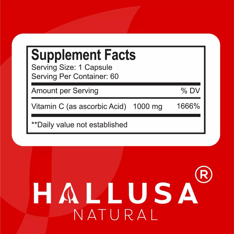 HALLUSA NATURAL VITAMIN C 1000mg - Powerful Antioxidant - Immune System - Supplement - 60 Cap