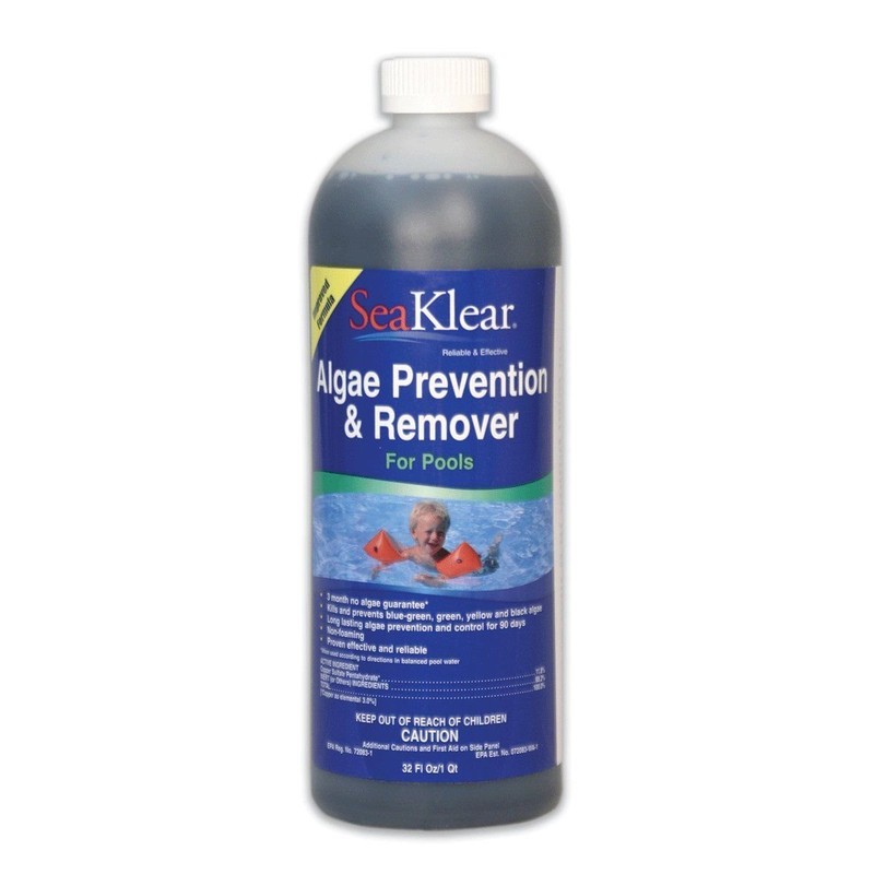 SeaKlear Algae Prevention and Remover lasts up to 90 days and uses an effective and economical low dose organic copper complex which prevents and kills all types of algae including blue-green, black and mustard algae. This algaecide is perfect for winterizing, vacation treatments and Spring start- ups. The odor free, non-staining, non-irritating formula is very economical, 1/2 bottle (16 oz) will treat 10,000 gallons helping reduce your overall chemical costs. The active ingredient is copper sulphate pentahydrate (11.83%). This product is not compatible with Nature2 or Biguanide products.