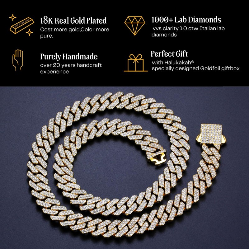 - 💎EXPERIENCE UNMATCHED LUXURY Treat yourself to the luxury of over 1000 hand-set laboratory diamonds adorning our Halukakah Gold/Platinum Plated Diamond Cuban Link Bracelet and Necklace for Men. Immerse yourself in the exquisitely crafted design that enhances your style and showcases over 12mm of flawless craftsmanship.