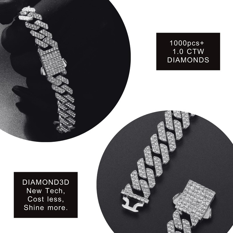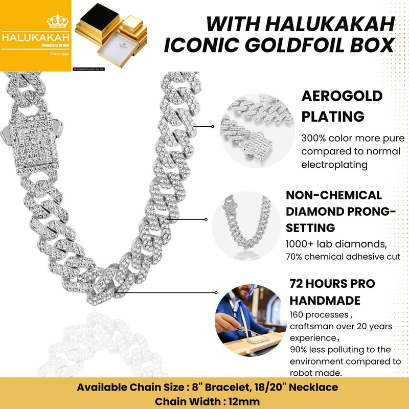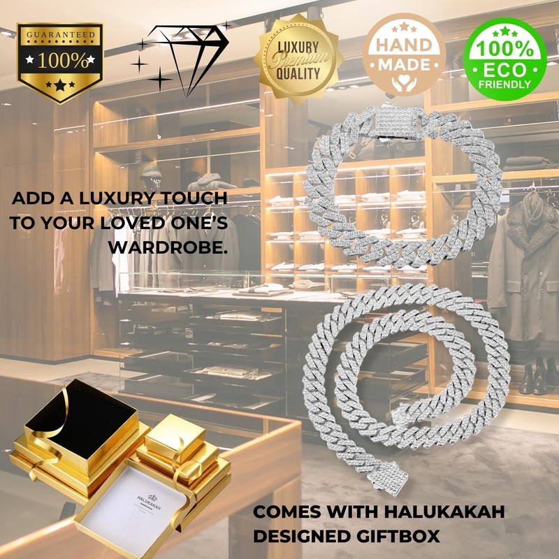 - EXPERIENCE UNMATCHED LUXURY Treat yourself to the luxury of over 1000 hand-set laboratory diamonds adorning our Halukakah Gold/Platinum Plated Diamond Cuban Link Bracelet and Necklace for Men. Immerse yourself in the exquisitely crafted design that enhances your style and showcases over 12mm of flawless craftsmanship