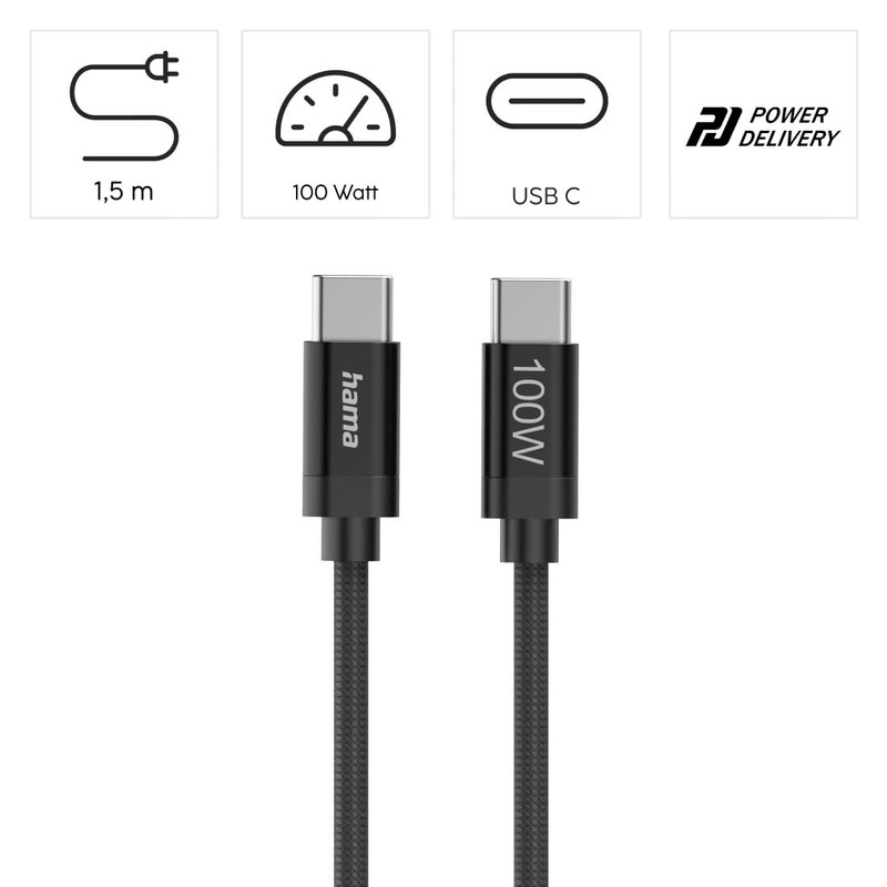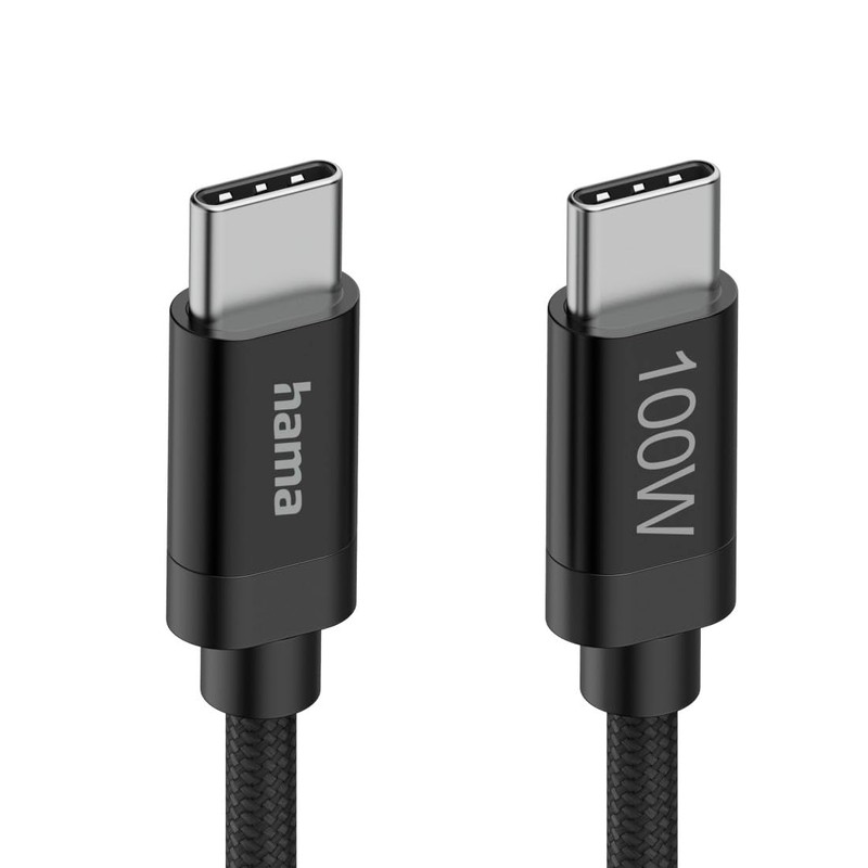 Hama Ladekabel Fabric, USB-C - USB-C, 100W, 1,5 m, Nylon, Schwarz
