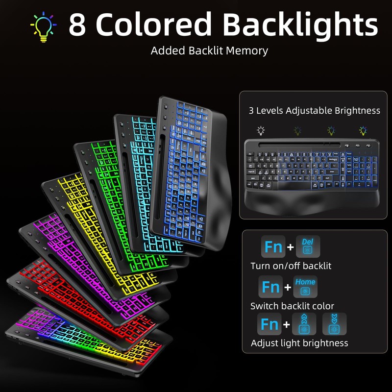 - Light Up Keyboard and Mouse Wireless: This ergonomic wave keyboard features 7 customizable backlight modes plus dynamic RGB LED glow. The mouse also has color-shifting RGB. Switch off or personalize the light/colors. The backlit keys and lighted mouse create an immersive experience in the dark