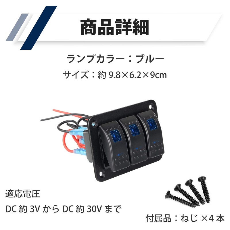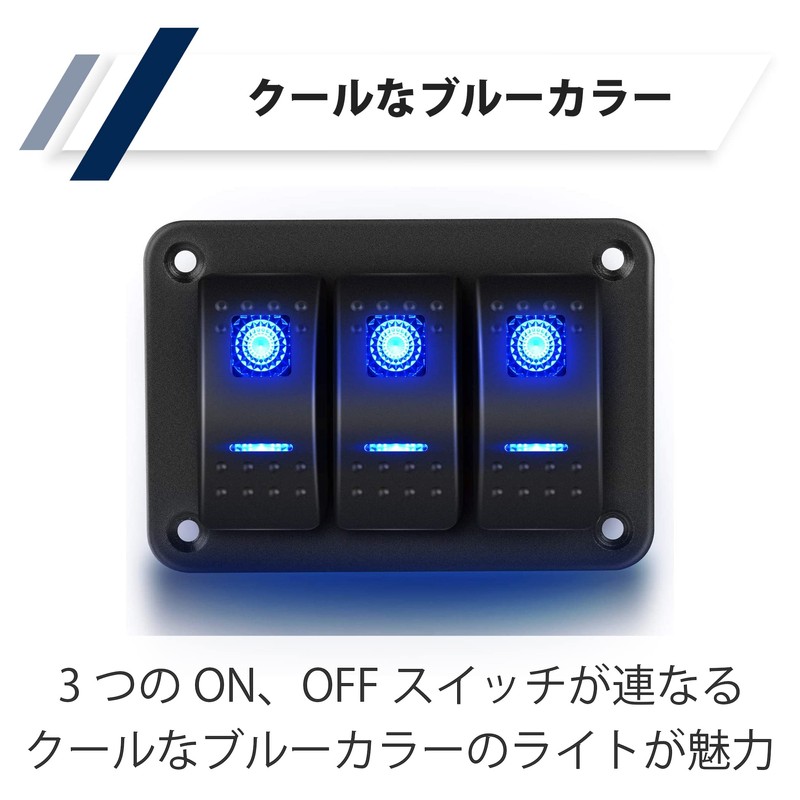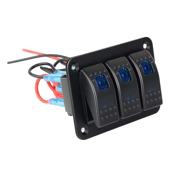 - 3-gang boat switch: This is a 3-gang type boat switch that adapts to voltage from about 3V DC to about 30V DC. The cool blue light is a stunning item. 3 ON and OFF switches together design, you can control 3 devices at the same time
