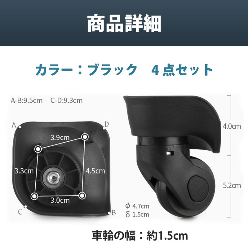 Set Contents: 4-piece set. Height: Approx. 3.6 inches (9.2 cm). Wheel Width: Approx. 0.6 inches (1.5 cm). Color: Black. *Depending on your monitor settings, there may be slight differences in the appearance of the product.