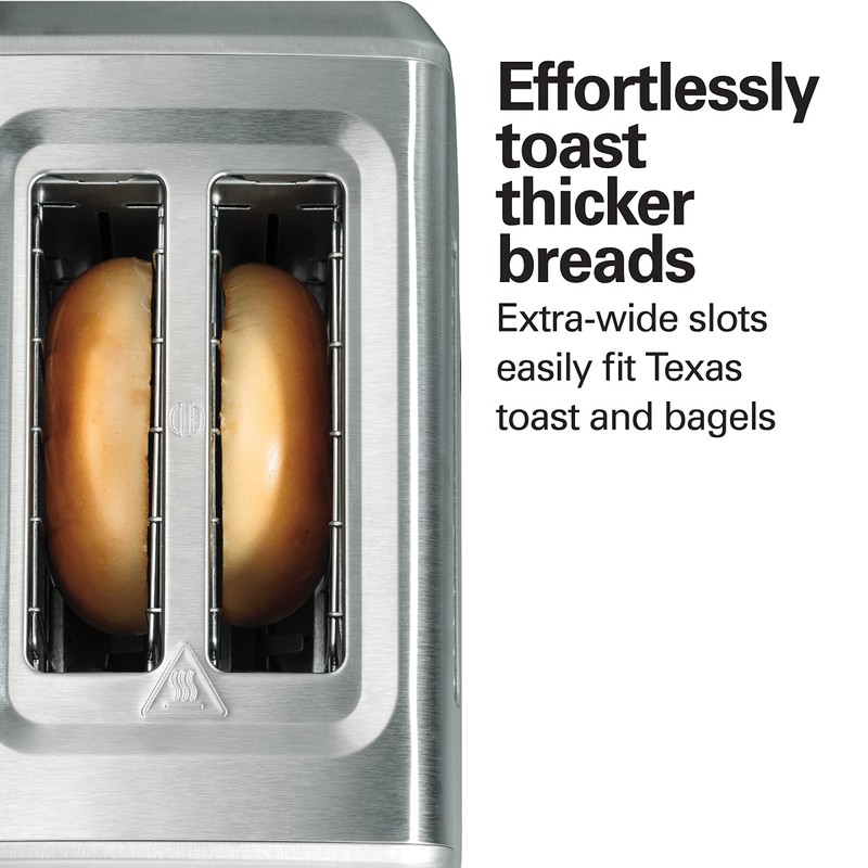 - EFFORTLESSLY TOAST THICKER BREADS: The toast slots on this stainless steel toaster are extra wide to easily fit thicker breads like Texas toast and bagels.